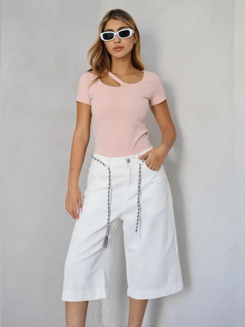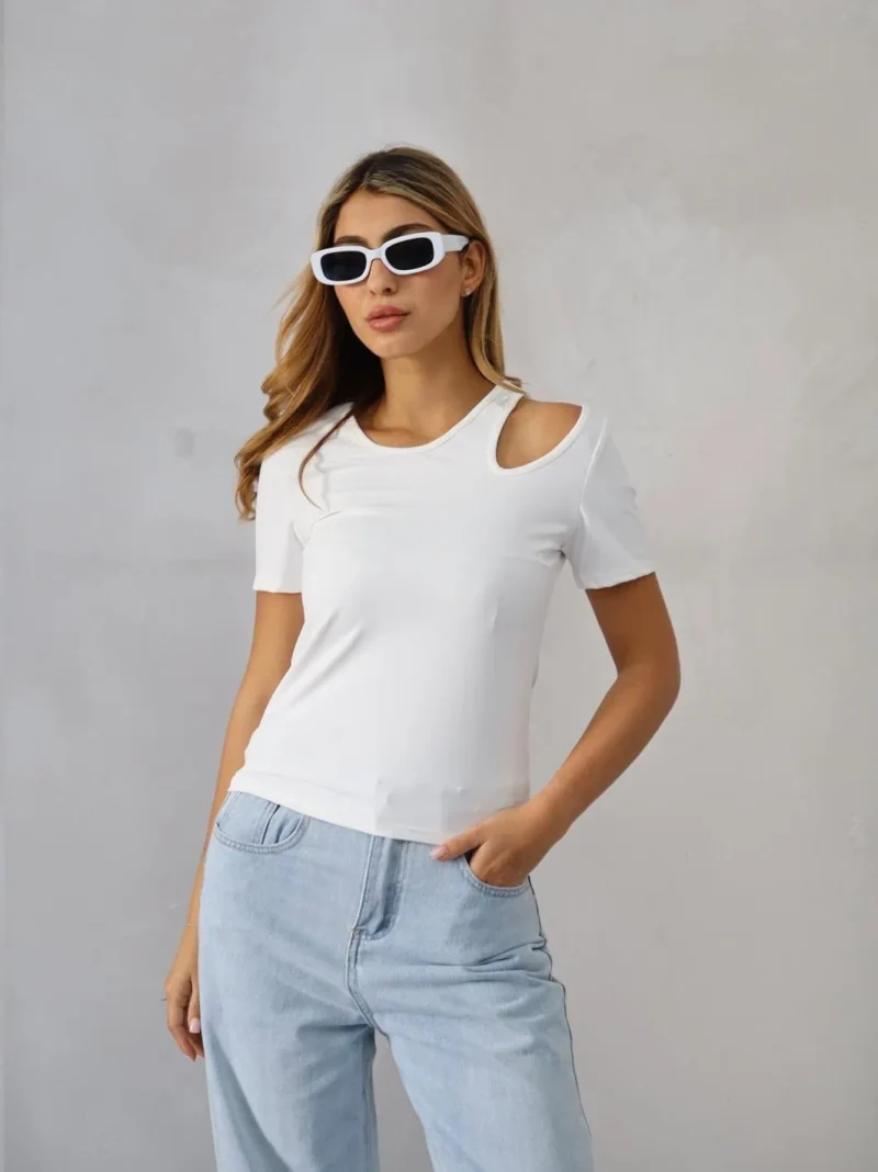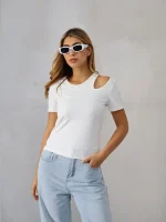 Blusa casual de cuello redondo y manga corta. Su diseño liso destaca por una abertura decorativa en el escote, aportando un toque original y fresco a una silueta cómoda. Perfecta para combinar con jeans.