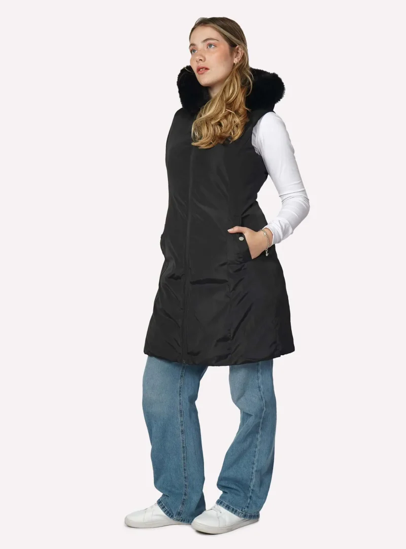 El chaleco doble vista Lily combina elegancia, confort y versatilidad en una sola prenda. Su diseño moderno y alargado estiliza la figura, mientras que su forro interno con piel sintética en el cuello aporta un toque sofisticado y abrigador.