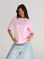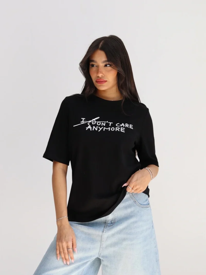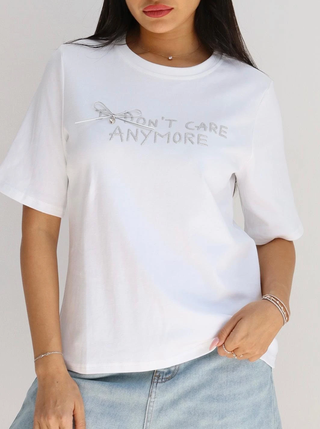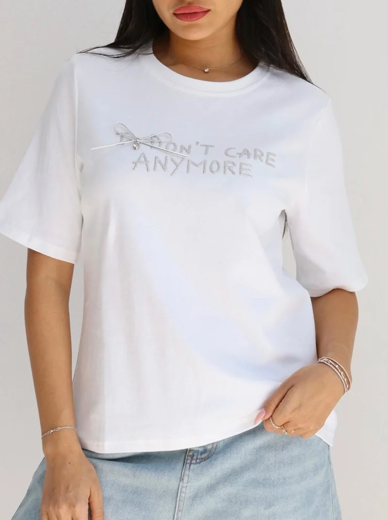 Playera blanca de corte clásico con cuello redondo y manga corta. Destaca por su estampado frontal con la frase ‘I DON’T CARE ANYMORE’ en tono plateado, decorada con un original detalle de moño en 3D. El básico perfecto con un toque de actitud.