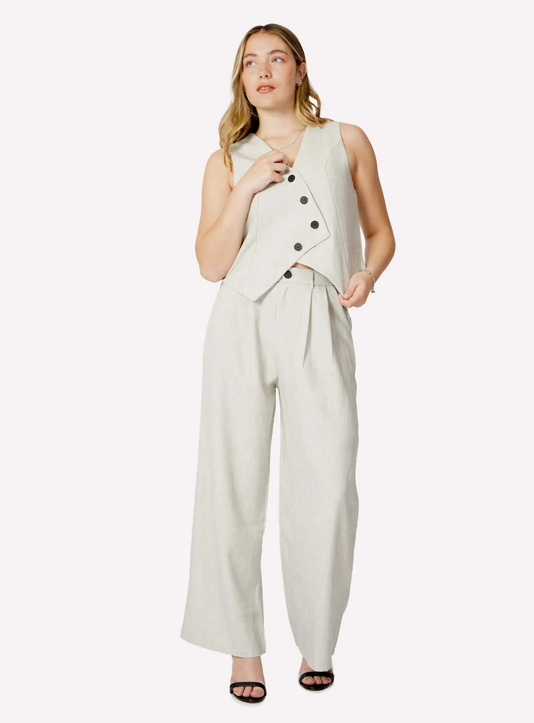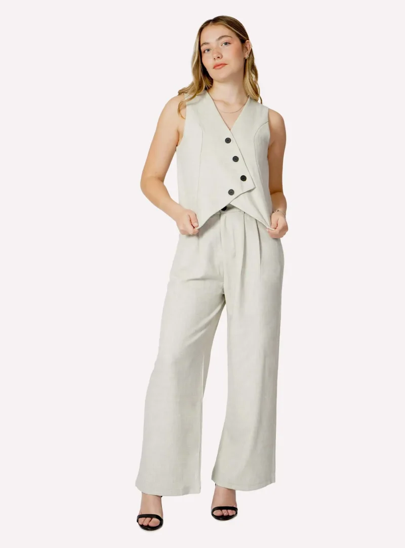 Eleva tu estilo con este sofisticado set de dos piezas. Inspirado en la sastrería clásica con un giro moderno y asimétrico, este conjunto coordinado es la definición de «chic sin esfuerzo». Es una opción increíblemente versátil que puedes lucir junta para un impacto total o por separado para multiplicar tus looks.